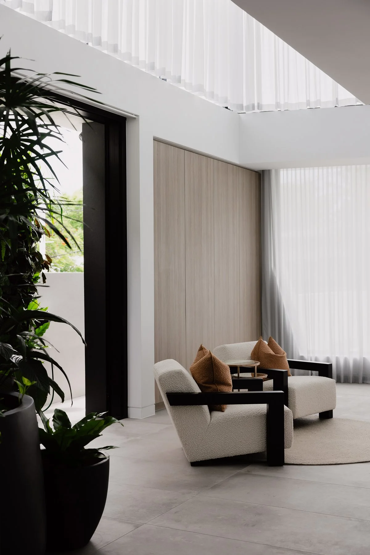 With plenty of natural light to the entry, the main focal point of this space was the flooding natural light and established green wall bringing the outside in. We provided an entry landing area with 2 large structured entry chairs, round feature rug and a pop of rust tones that permeate the remainder of the deign scheme. The internal green wall provides a lush setting that effortlessly blurs the interiors and outdoors.